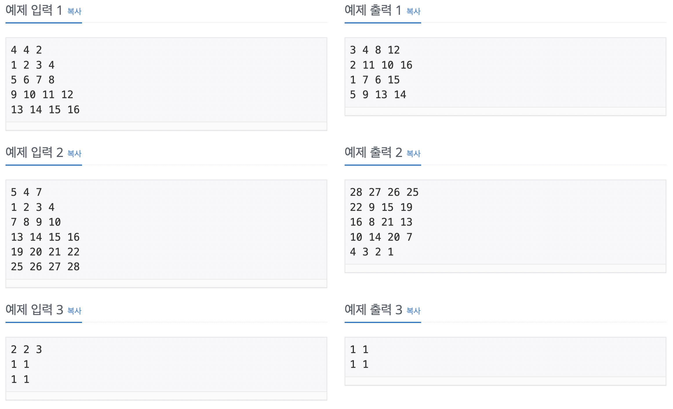 첫째 줄에 배열의 크기 N, M과 수행해야 하는 회전의 수 R이 주어진다.
