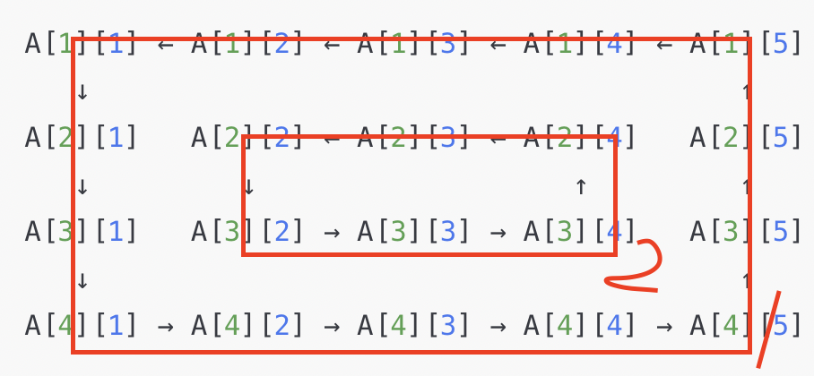 A[3][1] A[3][2] → A[3][3] → A[3][4] A[3][5]