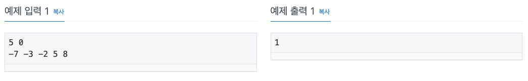 첫째 줄에 정수의 개수를 나타내는 N과 정수 S가 주어진다. (1 ≤ N ≤ 20, |S| ≤ 1,000,000) 둘째 줄에 N개의 정수가 빈 칸을 사이에 두고 주어진다. 주어지는 정수의 절댓값은 100,000을 넘지 않는다.