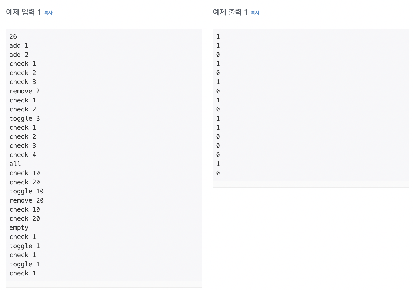 - toggle x: S에 x가 있으면 x를 제거하고, 없으면 x를 추가한다. (1 ≤ x ≤ 20)