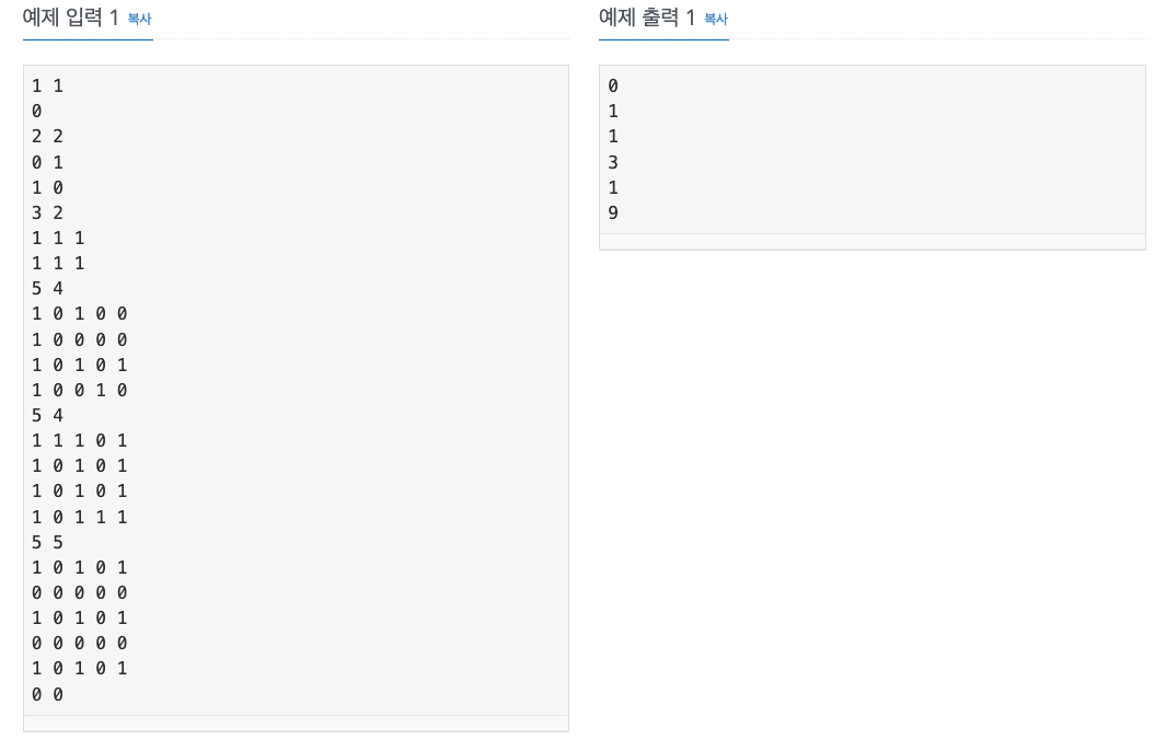 둘째 줄부터 h개 줄에는 지도가 주어진다. 1은 땅, 0은 바다이다.
