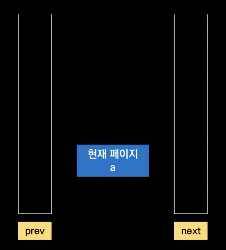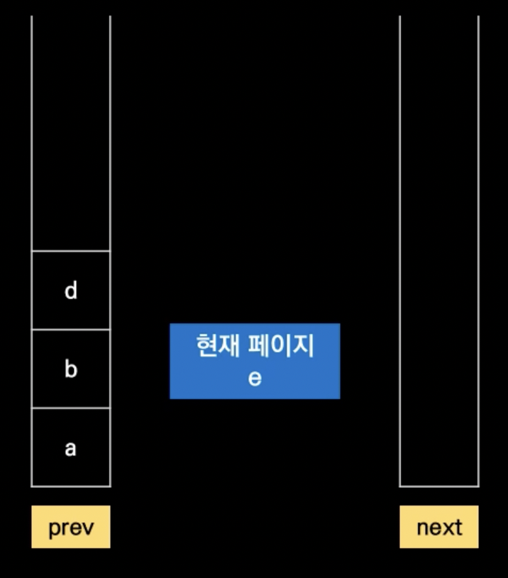 뒤로 가기: 방금 전 페이지를 next 스택에 넣는다 → prev 스택의 top 페이지로 이동 → prev 스택의 값 pop