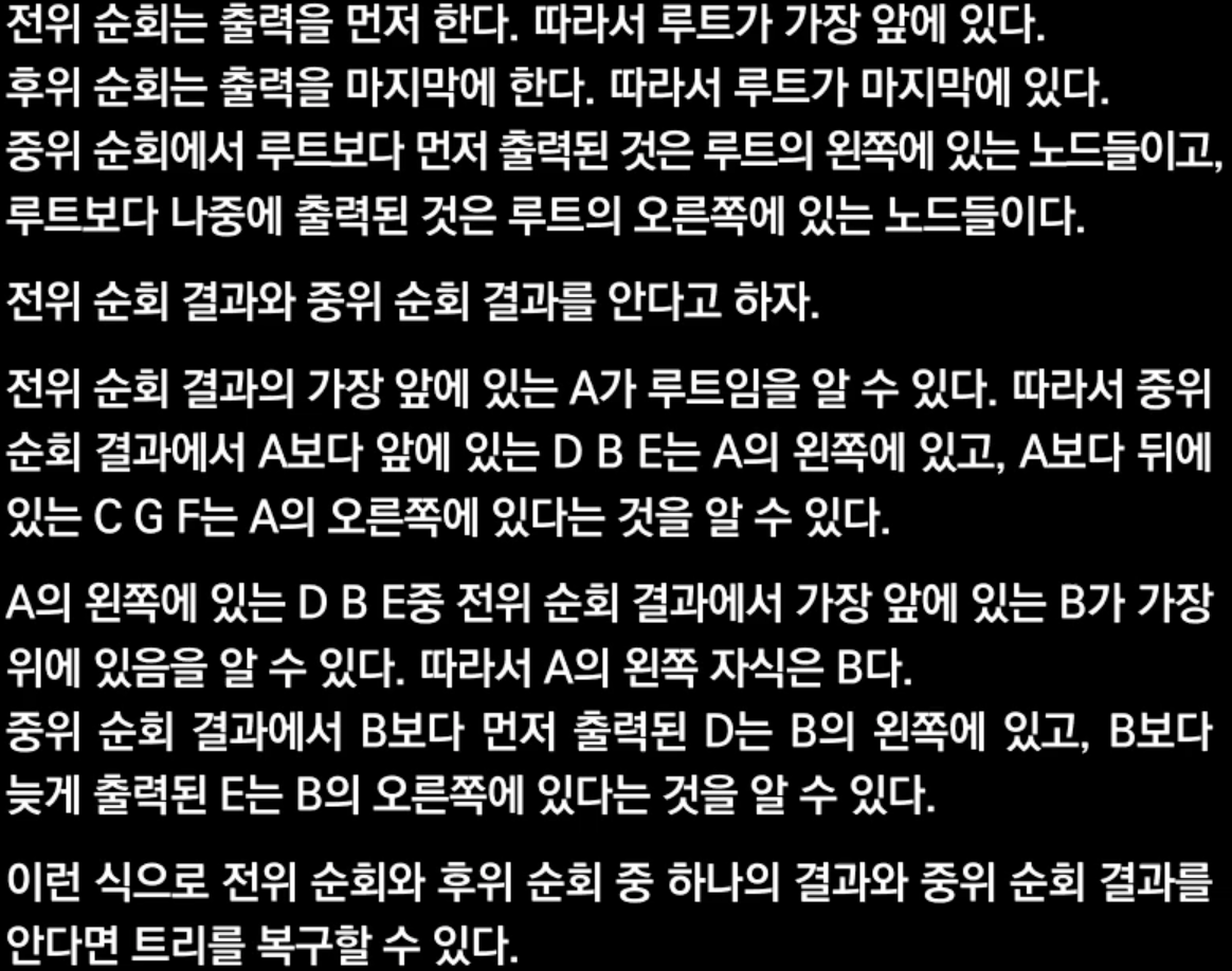 트리 복구: 중위 + 전위/후위 통해 나머지 하나의 순회 결과를 알 수 있다
