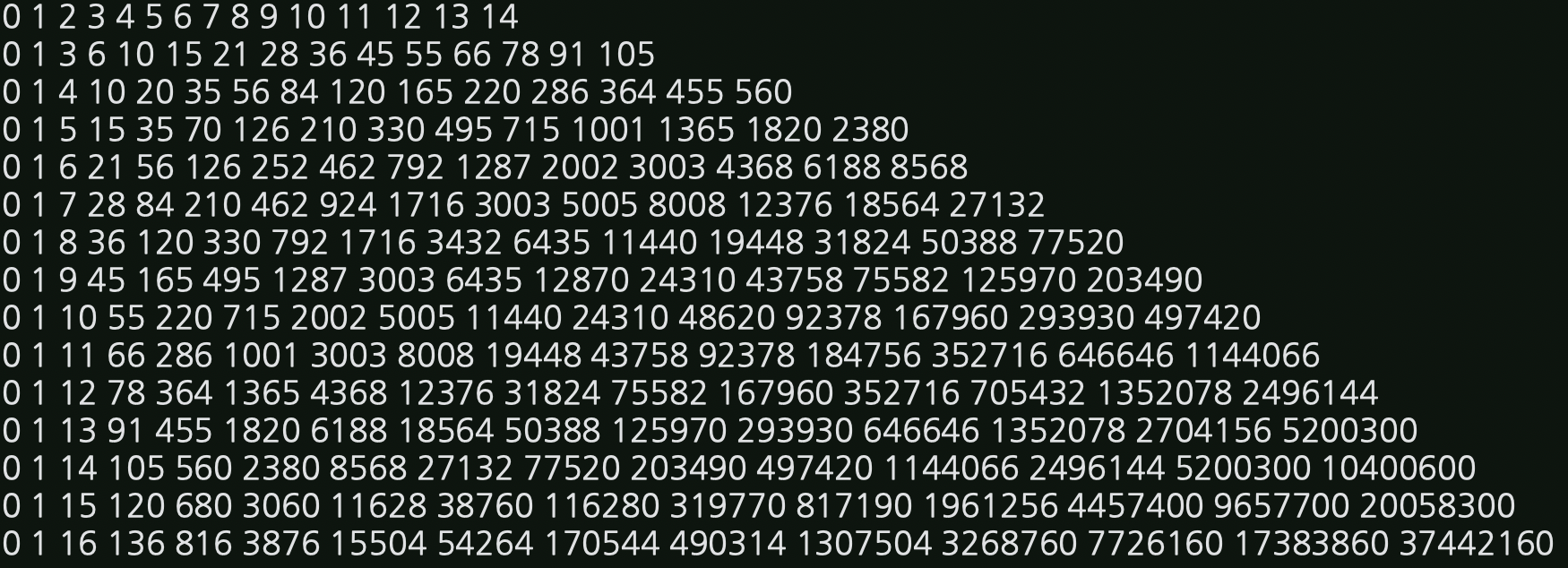 arr[k][n] = arr[k-1][n] + arr[k][n-1];