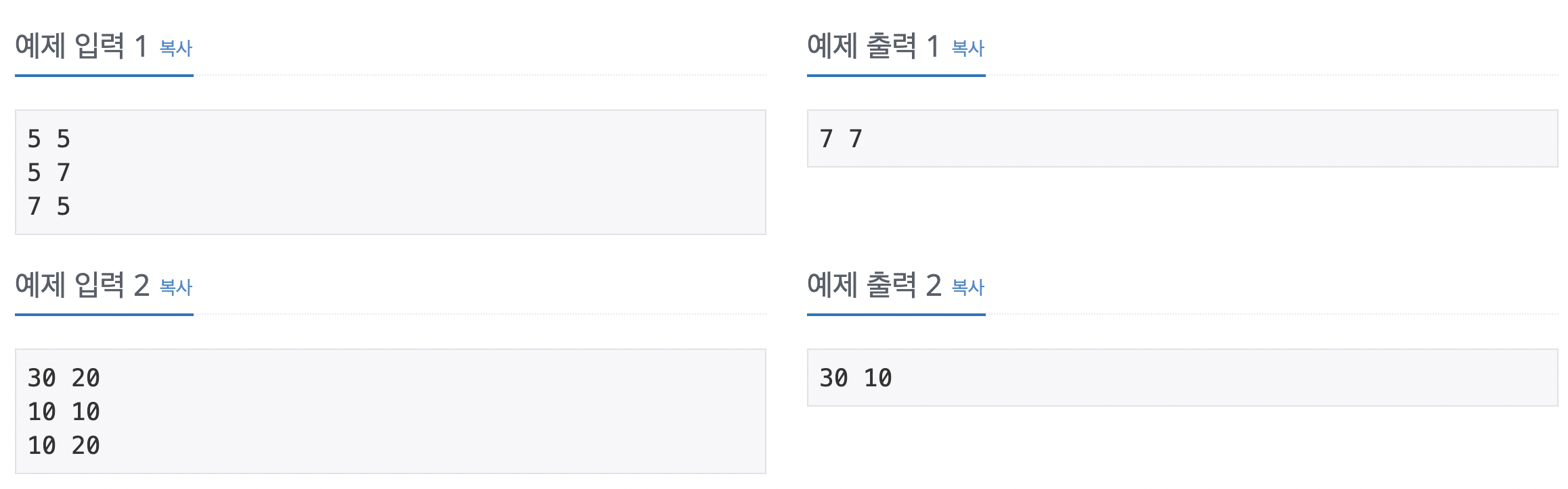 세 점이 주어졌을 때, 축에 평행한 직사각형을 만들기 위해서 필요한 네 번째 점을 찾는 프로그램을 작성하시오.