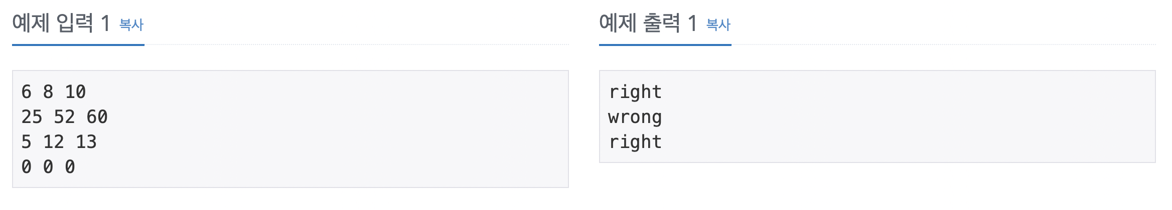 각 입력에 대해 직각 삼각형이 맞다면 "right", 아니라면 "wrong"을 출력한다.