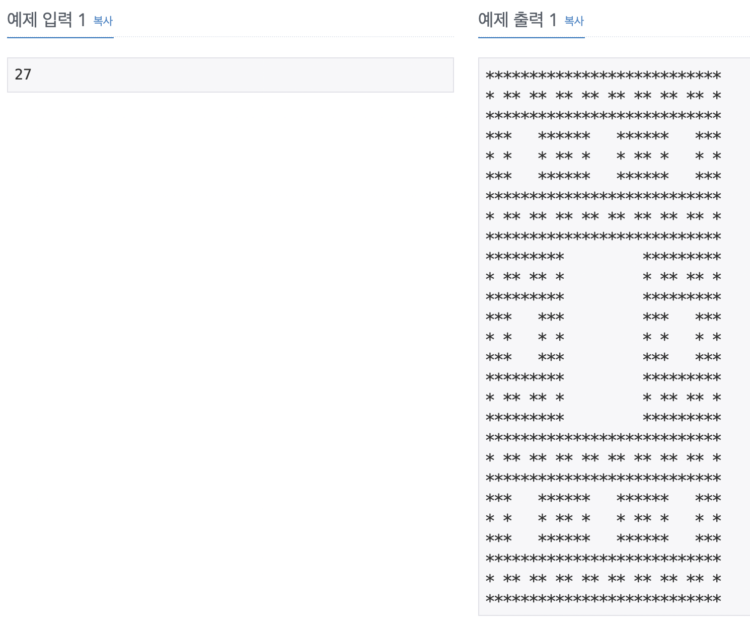 N이 3보다 클 경우, 크기 N의 패턴은 공백으로 채워진 가운데의 (N/3)×(N/3) 정사각형을 크기 N/3의 패턴으로 둘러싼 형태이다. 예를 들어 크기 27의 패턴은 예제 출력 1과 같다.