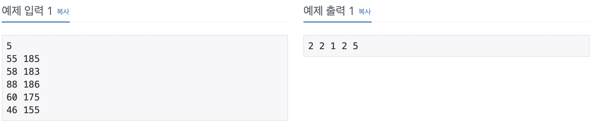 여러분은 입력에 나열된 사람의 덩치 등수를 구해서 그 순서대로 첫 줄에 출력해야 한다. 단, 각 덩치 등수는 공백문자로 분리되어야 한다.