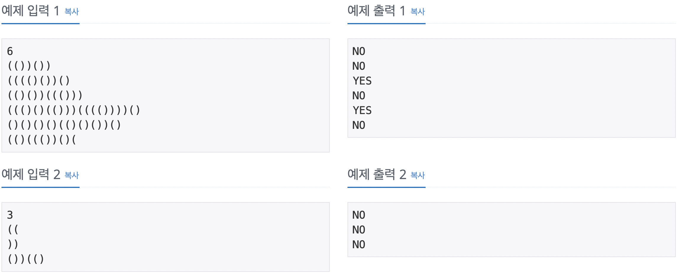 출력은 표준 출력을 사용한다. 만일 입력 괄호 문자열이 올바른 괄호 문자열(VPS)이면 “YES”, 아니면 “NO”를 한 줄에 하나씩 차례대로 출력해야 한다.