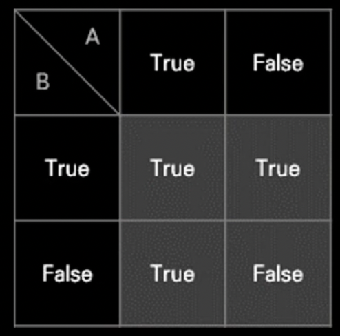 둘 모두 거짓이면 위 명제는 거짓이다. A || B 식은 A와 B의 값에 따라 아래 표와 같이 결과가 나온다.