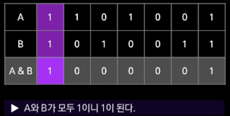 2진법의 수 A, B에 대해 A&B는 앞에서 배운 && 연산을 같은 위치의 모든 비트에 대해 해주면 된다.