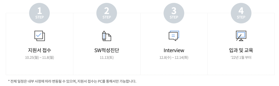 삼성 청년 SW 아카데미 졸업을 앞두고 취업 준비를 하고 있었습니다. 한국사 1급도 따고 토익도 공부하고... 전공에 1도 흥미를 못느꼈던 저는 이건 취업을 해도 문제다 싶었습니다 예전 재밌다고 생각한 프로그래밍 공부를 시작합니다. 그 때가 8월 25일이네요 그 이후로 아무것도 안하고 프로그래밍 언어, 알고리즘 공부를 하기 시작합니다 그렇게 혼자 공부하며 국비교육을 신청해놓고 SSAFY를 목표로 공부했습니다 지원 절차 STEP 1. 지원서 접수 간단한 인적사항을 적었습니다 경력 사항하고 어학 성적 표기란은 있지만 구체적인 경험을 적는 곳은 없어서 당황했던 기억이 납니다 STEP 3. 인터뷰에서 경험을 잘 녹여야겠다 생각하고 적을 것만 적고 제출했습니다 STEP 2. SW 적성진단 + 에세..